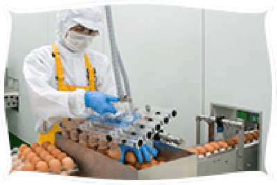 にんにくは洗浄室で洗浄をしたもののみ取り出し口を通って裏ごし室に運ばれます。卵は消毒した卵のみ裏ごし室に運ばれます。